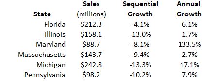 BDSA provides coverage for Florida, Illinois, Maryland, Massachusetts, Michigan and Pennsylvania. In January, year-over-year growth ranged from 1.7% in Illinois to +133.5% in Maryland, which recently introduced adult-use. Note that Florida and Pennsylvania are medical-only markets. Sequential growth was negative in all markets. The annual growth in Florida fell from December and was the lowest yet, and annual growth was meager except in two states.