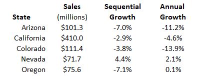 BDSA provides coverage for Arizona, California, Colorado, Nevada and Oregon. In January, year-over-year growth was negative in 3 of the 5 states, with the annual growth rates ranging from -13.9% in Colorado to 2.1% in Nevada. Growth rose sequentially in all but Nevada.