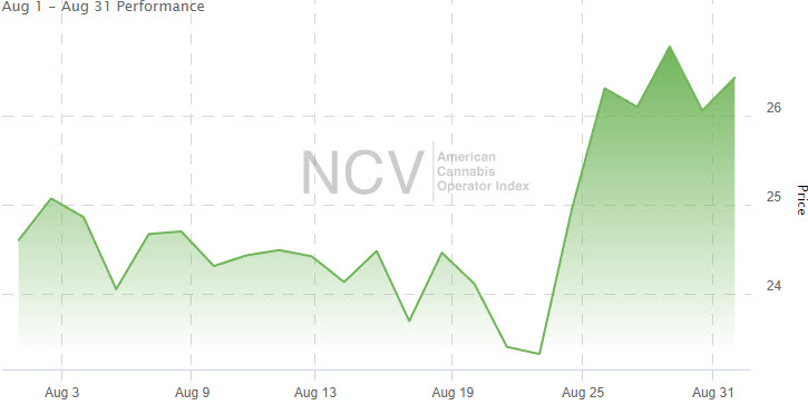 The American Cannabis Operator Index rose dramatically again in August, gaining 6.7% to 26.43 after rallying an even bigger 18.8% in July that has left the index up 26.8% in Q3 thus far:
