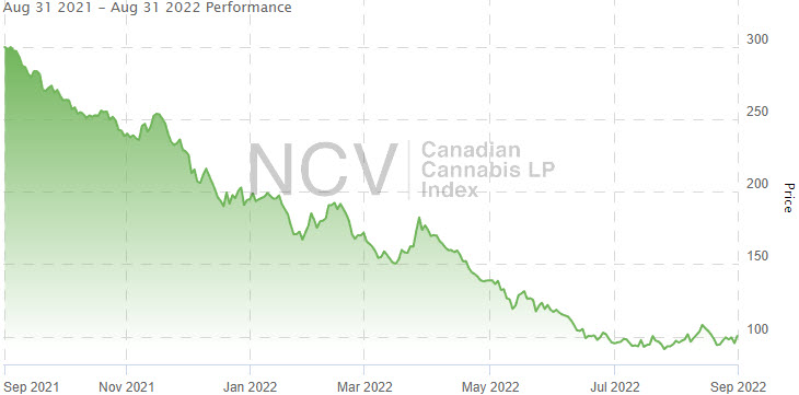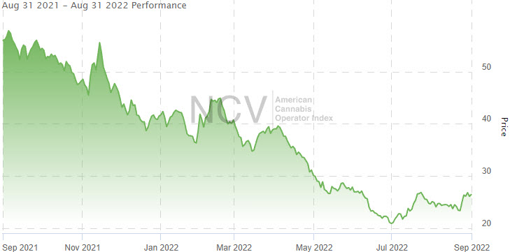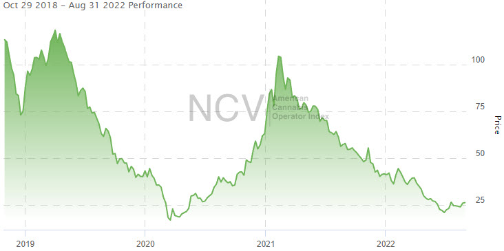 For 2022, the index is now down 36.6%, which is much better than the Global Cannabis Stock Index return of -53.7%: