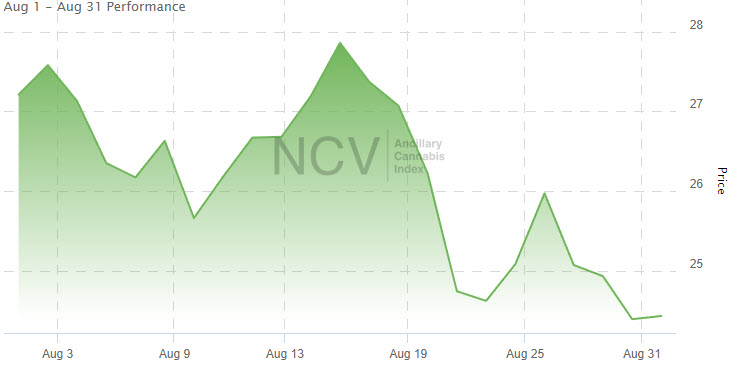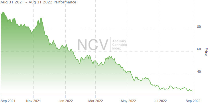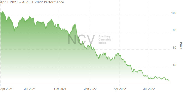 The Ancillary Cannabis Index has been a terrible sector in 2022, and in August it decreased 10.4% to 24.43: