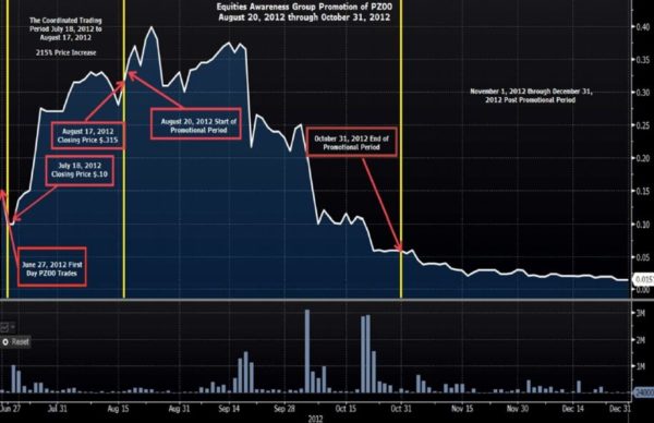 The SEC alleges that Farinella paid EAG to promote the Pazoo (OTC: PZOO), enabling him to reap gains of over $1mm in 2012, before the company made its transition into the cannabis industry. The full complaint details a multi-phased scheme in which Farinella installed an associate as CEO (David Cunic, whom the SEC described as “Individual A, a physical therapist with no known experience managing a public company”). The company had gone public through the S-1 process, and Farinella controlled approximately 98% of the unrestricted common stock, according to the SEC. In the second phase, the group allegedly manipulated trading in the stock to create an appearance of an active trading market. Ultimately, the stock was promoted by EAG and the company itself through press releases (at least 20!), enabling Farinella to pocket over $1.1mm on the sale of over 8mm shares through the end of 2012, with EAG receiving $820K. The SEC’s complaint shows how the stock moved up and then down during the alleged activity: