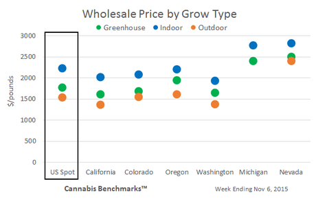 Cannabis Benchmarks 110615Each week, New Leaf Data Services publishes a weekly assessment of cannabis prices by evaluating the legal prices  for a standardized potency across a variety of markets.  From an overall perspective, prices fell by almost 1%  this week to $1826 per pound from $1839, with most reported transactions between $1611 and $2531 per pound.  The report stated that outdoor prices averaged $1535, while greenhouse and indoor were $1767 and $2228, respectively.