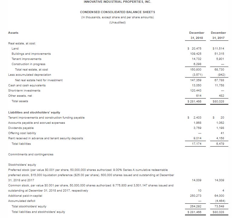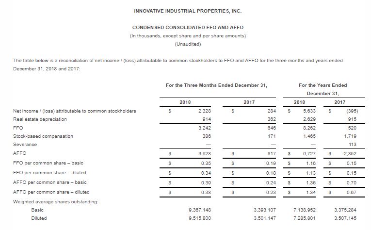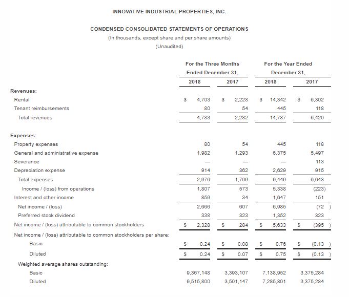 Innovative Industrial Properties Reports Fourth Quarter and Full-Year 2018 Results