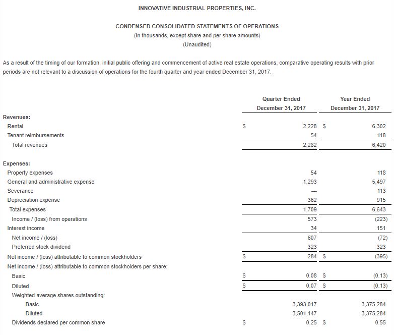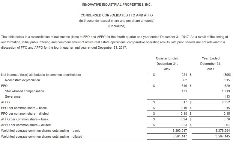 SAN DIEGO–(BUSINESS WIRE)–Innovative Industrial Properties, Inc. (NYSE: IIPR) (the “Company”) announced today results for the fourth quarter and year ended December 31, 2017, the fourth full quarter since the Company commenced real estate operations and completed its initial public offering in December 2016.Fourth Quarter 2017 Highlights