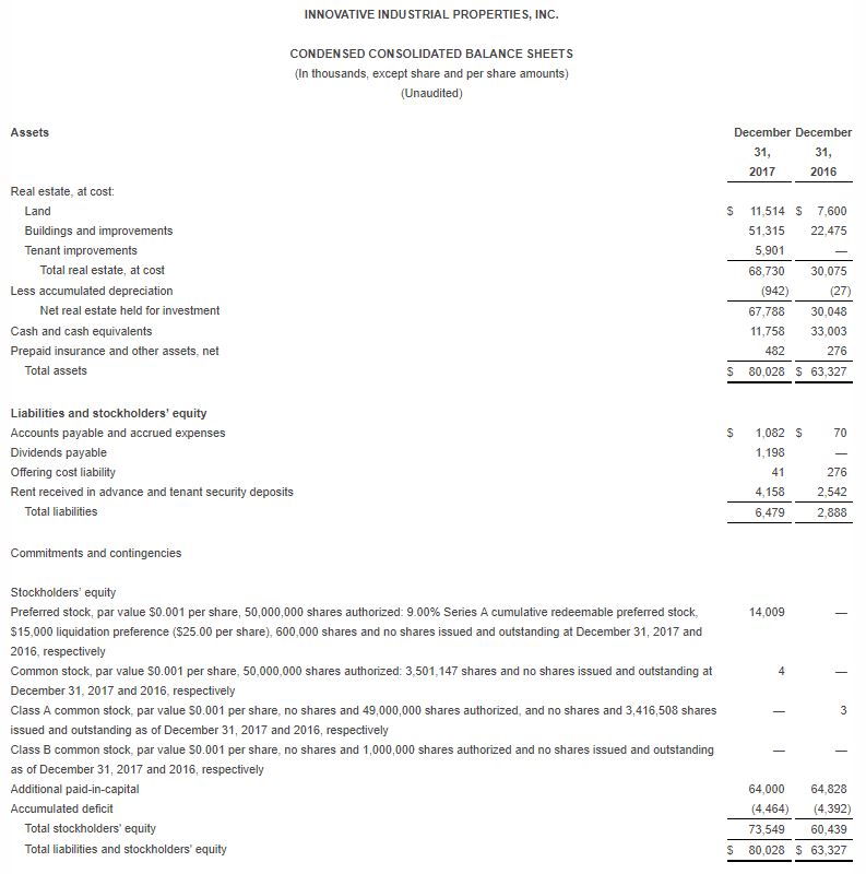 Innovative Industrial Properties Reports Fourth Quarter and Full-Year 2017 Results
