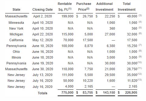 (9) The amount relates to an amendment to our lease and development agreement which increased the construction funding at one of IIP’s Illinois’ properties by $3.0 million to a total of $10.0 million, and also resulted in a corresponding adjustment to the base rent for the lease at the property. As of August 5, 2020, IIP had funded approximately $7.5 million of the construction funding.