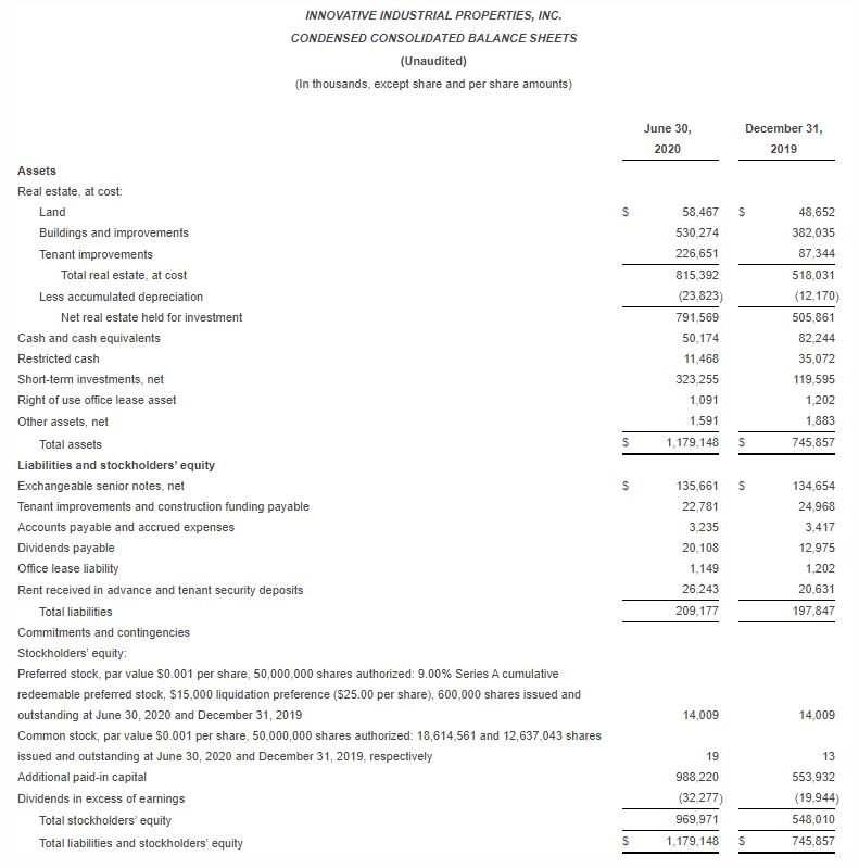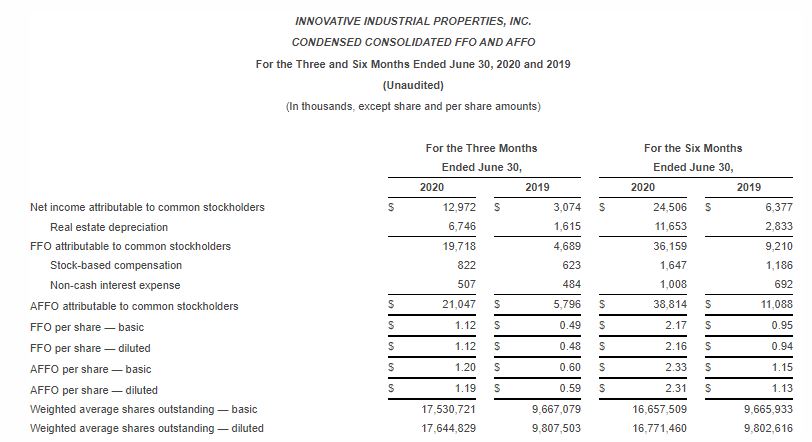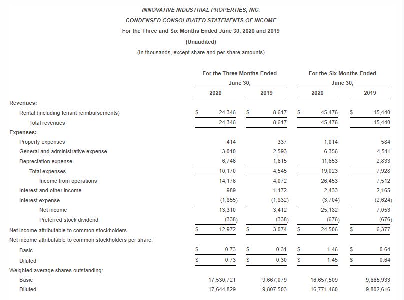 Innovative Industrial Properties Reports Second Quarter 2020 Results