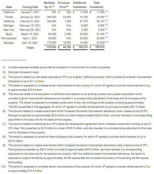 IIP acquired the following properties and made the following additional funds available to tenants for improvements at IIP’s properties during the period from January 1, 2021 through May 5, 2021 (dollars in thousands):