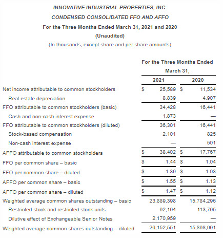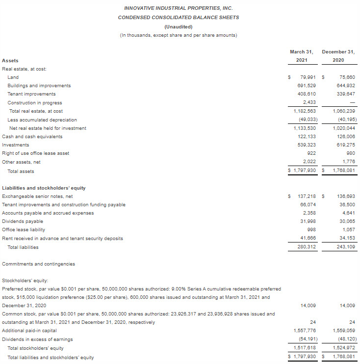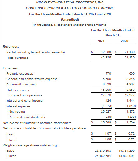 Innovative Industrial Properties Reports First Quarter 2021 Results