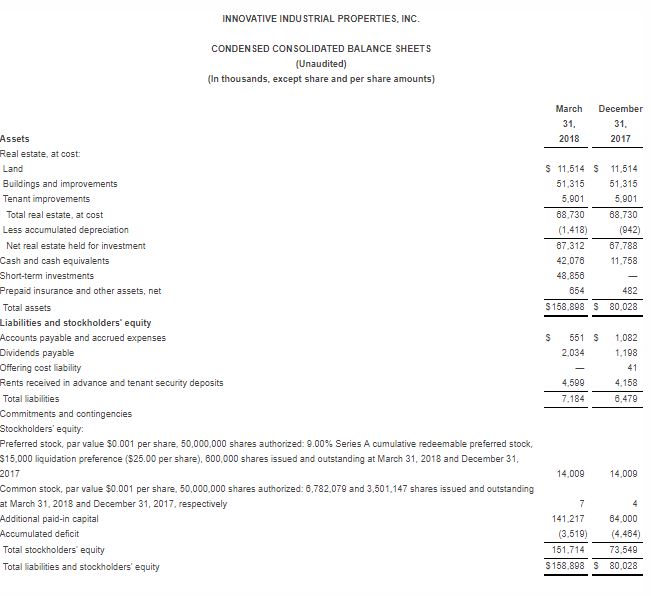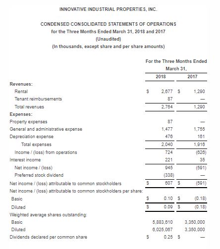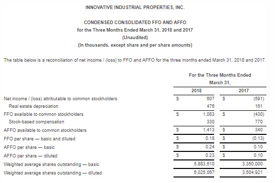 Innovative Industrial Properties Reports First Quarter 2018 Results