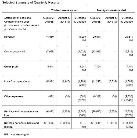 During the thirteen weeks ended August 3, 2019, the Company generated revenue of $11.1 million including cannabis and cannabis-related accessory sales of $9.7 million, wholesale sales of $0.9 million and digital development revenue of $0.5 million. During the thirteen weeks ended May 4, 2019, the Company generated revenue of $9.5 million including cannabis and cannabis-related accessory sales of $7.7 million, wholesale sales of $1.3 million and digital development revenue of $0.5 million. Revenues are expected to continue to increase as the Company acquires new licences, opens additional retail cannabis stores, and continues to commercialize the HifyreTM digital retail and analytics platform subject to the issuance of new licences and the entry of the Company into new markets.