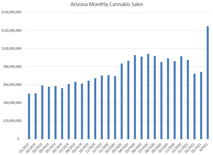 Arizona transitioned to adult-use in late January, but this is the first month that BDSA included adult-use sales. Total cannabis sales grew 68% to $124.9 million, with adult-use representing $52.8 million. Medical cannabis sales fell 17% to $72.1 million. Growth was strong across all categories, but the highest growth by far was in pre-rolls, which gained 156%.