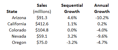 Cannabis sales decreased 0.3% sequentially in November, which was an increase on a per-day basis of 3.0%. In this review, we share the results by state, beginning with the western markets and then concluding with the eastern markets. In total, BDSA estimates that sales across the 15 markets totaled $1.80 billion during November, which was up 4.2% from a year ago due to the large gain in New York Excluding this, which I explain below, sales fell 4.7%. BDSA updated its Illinois numbers after the state changed its way of counting sales recently.