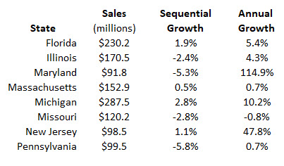 BDSA provides coverage for Florida, Illinois, Maryland, Massachusetts, Michigan, Missouri, New Jersey and Pennsylvania. We are including Missouri and New Jersey for the first time. In June, year-over-year growth ranged from -0.8% in Missouri to +114.9% in Maryland, which began adult-use about a year ago. Note that Florida and Pennsylvania are medical-only markets. Sequential growth was positive in 4 markets despite one less day in June. The annual growth was meager except in three states. Michigan’s growth of 10.2% was the slowest annual growth yet. Last year, it grew 39.2% in June from a year earlier.