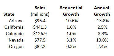 BDSA provides coverage for Arizona, California, Colorado, Nevada and Oregon. In June, year-over-year growth was negative in 2 of the 5 states, with the annual growth rates ranging from -13.8% in Arizona to 13.0% in Nevada. Growth fell sequentially in just one of the states despite one less day during June.