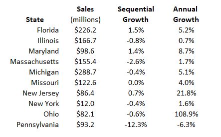 BDSA provides coverage for Florida, Illinois, Maryland, Massachusetts, Michigan, Missouri, New Jersey, New York (medical only), Ohio and Pennsylvania. In September, year-over-year growth ranged from -6.3% in Pennsylvania to +108.9% in Ohio, which began adult-use in August. Note that Florida and Pennsylvania are medical-only markets, and BDSA’s data doesn’t yet capture the adult-use market in New York (which is booming). Sequential growth was positive in 3 markets. The annual growth was meager except in two states. Ohio, which legalized for adult-use in August, more than doubled its total sales from a year earlier and led the way.