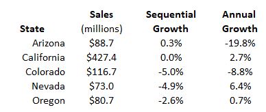 BDSA provides coverage for Arizona, California, Colorado, Nevada and Oregon. In September, year-over-year growth was negative in 2 of the 5 states, with the annual growth rates ranging from -19.8% in Arizona to 6.4% in Nevada. Growth fell sequentially in three of the states.