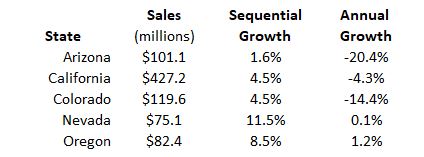 BDSA provides coverage for Arizona, California, Colorado, Nevada and Oregon. In March, year-over-year growth was negative in 3 of the 5 states, with the annual growth rates ranging from -14.4% in Colorado to 1.2% in Oregon. Growth rose sequentially in each of the states.