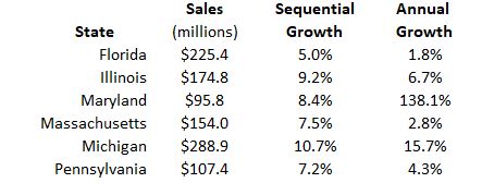 BDSA provides coverage for Florida, Illinois, Maryland, Massachusetts, Michigan and Pennsylvania. In February, year-over-year growth ranged from 1.8% in Florida to +138.1% in Maryland, which recently introduced adult-use. Note that Florida and Pennsylvania are medical-only markets. Sequential growth was positive in all 6 markets. The annual growth in Florida fell from was the lowest yet, and annual growth was meager except in three states.