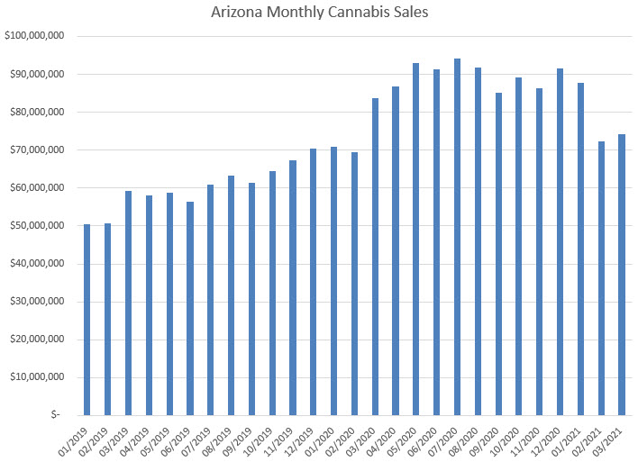 Arizona transitioned to adult-use in late January, and BDSA is projecting only medical sales, which rose 3% from February to $74.3 million and fell 11% from a year ago. Flower sales fell 8%, while pre-rolls increased 14%. Concentrates declined 11%, and ingestibles plunged by 25%.