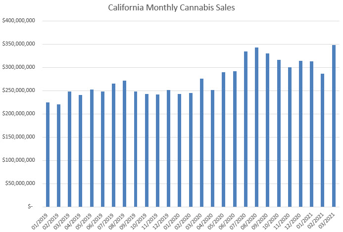 California set a record, with sales of $349 million growing 22% sequentially and 27% from a year ago. In February, annual growth had slowed to 17%, partially impacted by the comparison to a year ago, which had an extra day. Flower grew 32%, while pre-rolls surged 54%. Concentrates increased 21%, and ingestibles expanded by 11% compared to a year ago.