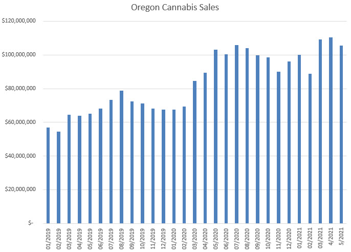 Facing a relatively easy comparison, sales in Nevada grew 49.9% to $87.4 million, slipping 0.5% from April. Next month should be better given that Las Vegas fully reopened in June. As in other states, pre-rolls led growth at 83%.