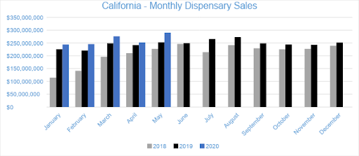 May, 2020 marked a high-point in sales for California’s regulated cannabis market, setting a new single-month record with $290.1 million in sales and representing 15 percent growth both from the trailing month and compared to May, 2019. Despite difficulties presented by the Covid-19 pandemic, both price and volume increased in line with consumer demand across nearly all product categories.