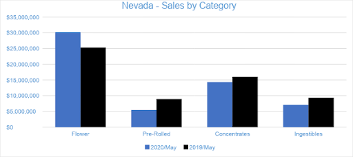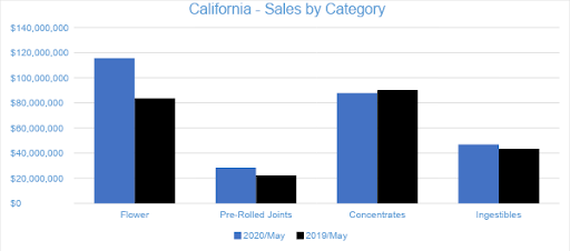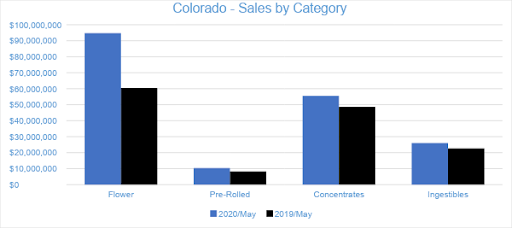 Sales of Flower generated $49.4 million in May 2020, accounting for 48 percent of overall revenues. Compared to the trailing month, Flower sales increased by 16 percent. Compared to May 2019, sales jumped by 121 percent. Pre-rolled Joints, which are tracked as a separate category, accounted for eight percent of overall revenues with $8.4 million in sales.