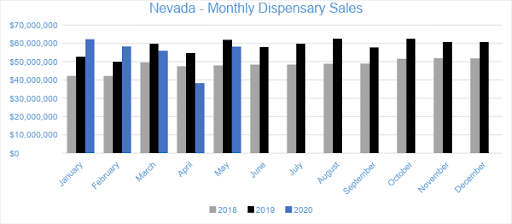 On May 9th 2020, Nevada dispensaries were permitted to resume in-store sales, though curbside pickup and delivery continued to be available and encouraged. The reopening of in-store sales resulted in a significant uptick in commerce as combined sales for both adult-use and medical dispensaries reached $58.2 million, growing by 52 percent from the trailing month. Sales remain six percent lower compared to May 2019. In addition to the reopening of in-store transactions, lower product pricing also contributed to the strong sales month. Year-to-date through May, sales in the market have reached $273.2 million, declining two percent compared to the same period last year.