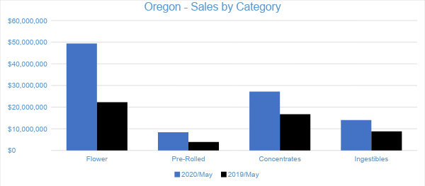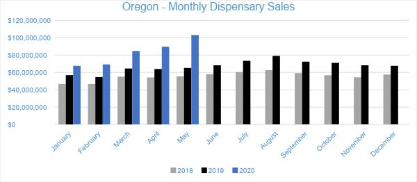 In May 2020, Cannabis sales in Oregon’s medical and adult-use dispensaries reached $103 million. Compared to the trailing month, sales in the Oregon market grew by about 15 percent. Compared to May 2019, sales grew by 87 percent overall. Year-to-date sales in Oregon have reached $414 million, growing by 51 percent compared to the same period in 2019.
