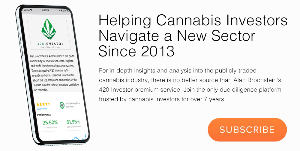 Get ahead of the crowd! If you are a cannabis investor and find value in our Sunday newsletters, subscribe to 420 Investor, Alan’s comprehensive stock due diligence platform since 2013. Gain immediate access to real-time and in-depth information and market intelligence about the publicly traded cannabis sector, including daily videos, weekly chats, model portfolios, a community forum and much more.