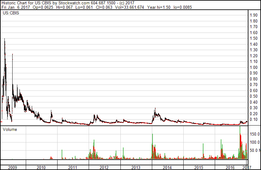 CBIS is one of the first publicly-traded cannabis-related stocks, with a debut in 2009. In its almost seven years of operations, it has demonstrated little success except in greatly expanding the number of shares outstanding (now over 2.3 billion as of November 7th). Insiders have been heavy sellers of the stock, often after press releases.