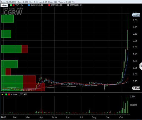 There are many examples of stocks that have increased to levels that are absurd, but perhaps none exceeds the insanity of CannaGrow Holdings (OTC: CGRW), which has rallied from $0.43 at year-end to an multi-year closing high of $3.20 today, a YTD gain of 644%. The stock ended September at $0.7397 and is up 333% so far in October: