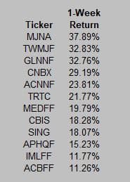 While Canopy Growth posted the second highest performance for the week, rising 32.8%, 12 of the 54 index members posted double-digit returns: