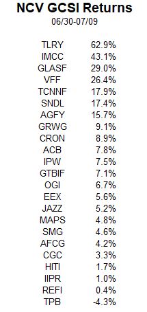22 of the 23 stocks are up, and 7 are double-digit gainers, all up more than 15%. Leading the way is Tilray Brands (NASDAQ: TLRY), which I have liked a lot but not so much anymore. At Seeking Alpha, I wrote about why I downgraded it to Neutral. Note that the company did schedule its fiscal Q4 financials release yesterday for 7/28.