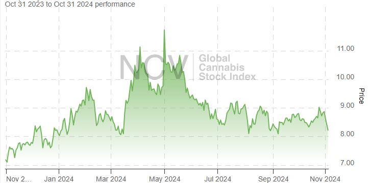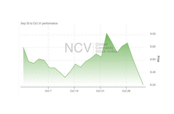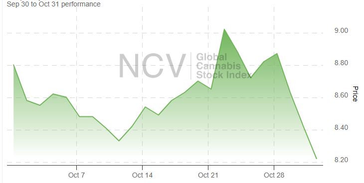 Cannabis stocks, as measured by the Global Cannabis Stock Index, passed the anniversary a year go when they exploded higher in late August on news that the Department of Health and Human Services had recommended to the DEA that it move cannabis from Schedule 1 to Schedule 3 with a weak month in August. The index had soared on the last day in April, when the DEA shared that it was officially recommending that rescheduling that had been requested, but it plunged in May and moved lower in June. In July and in the first part of August, the GCSI moved higher, but cannabis stocks fell sharply after the DEA announced late on August 26th that it was holding a hearing on December 2nd. The index gained in September, which helped the index advance marginally in Q3. For the month of October, the index was down 6.6% to 8.22: