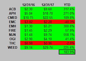 Like 2016, when a late-in-the year rally related to the elections in the United States and then a rotation into Canadian LPs fueled a full-year gain of 88.8%, the gains in 2017 came at the end of the year. On October 27th, the index was at 56.85, down 23.3% year-to-date, but news of the landmark investment by alcohol giant Constellation Brands (NYSE: STZ) into Canopy Growth (TSX: WEED) (OTC: TWMJF) set off a 150% rally into year-end that included nine consecutive weekly gains. More recently, the fuel for the rally has been optimism related to California legalizing on January 1st.