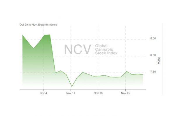 Cannabis stocks, as measured by the Global Cannabis Stock Index, have been quite volatile this year. The index gained in September, prompting a Q3 gain, but it fell in October. November was very tough, with the 9.5% loss to 7.44 leaving the index down year-to-date: