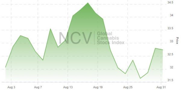 Overcoming pressure on Canadian LPs and CBD companies with very strong performance from American cannabis operators, the Global Cannabis Stock Index extended July gains during August by increasing 2.1% in choppy trading to 32.74: