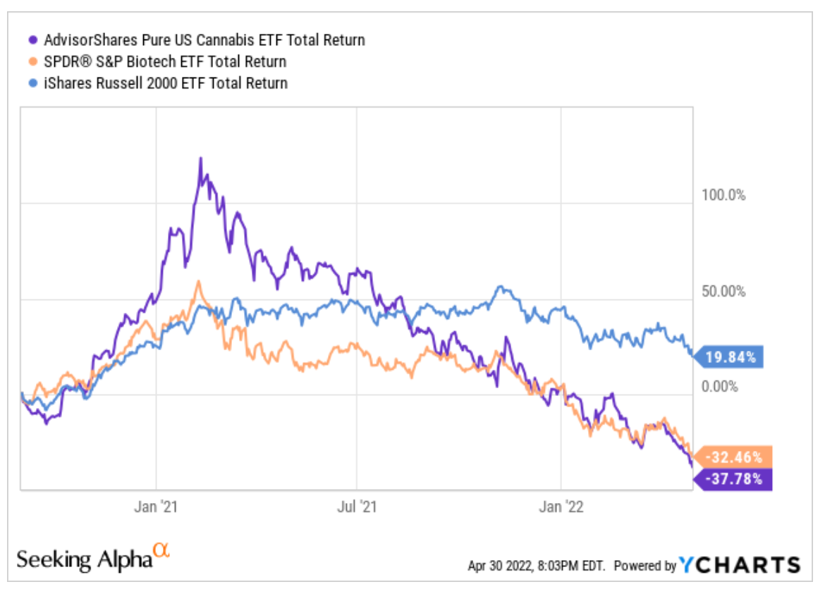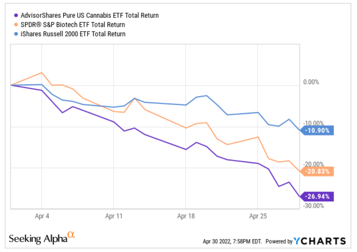 While one might compare cannabis stocks against other small cap stocks such as those in the iShares Russell 2000 ETF (IWM), you could argue the SPDR S&P Biotech ETF (XBI), which covers a gambit of biotech stocks, could be better to use due to its more speculative nature. When looking at MSOS against XBI, the performance in April between the two is more similar than comparing MSOS with IWM.