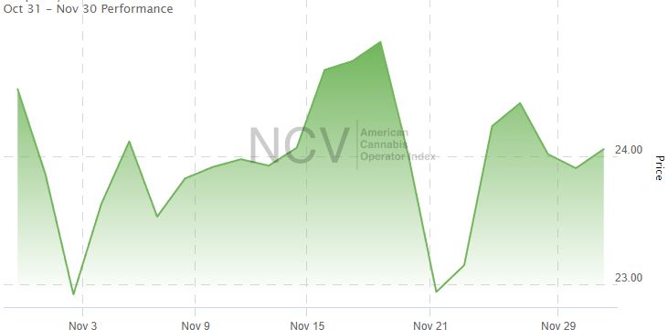 The American Cannabis Operator Index fell 30.0% in September and then rose 33.9% in October. In November, it dipped 1.9% despite the rally in cannabis stocks, falling to 24.06: