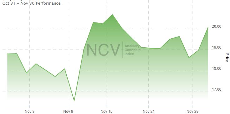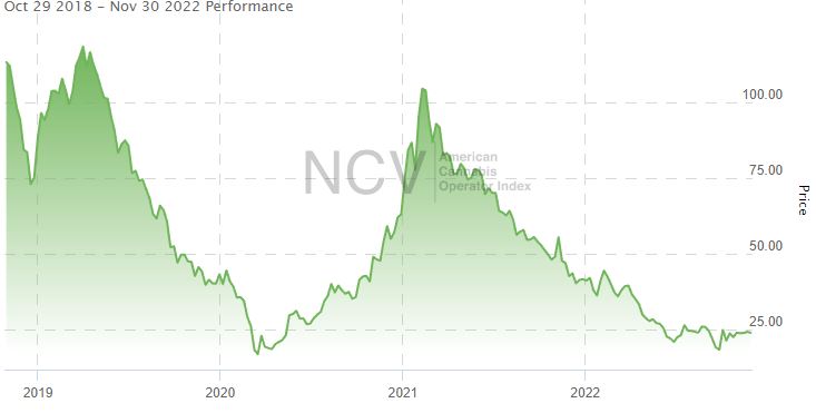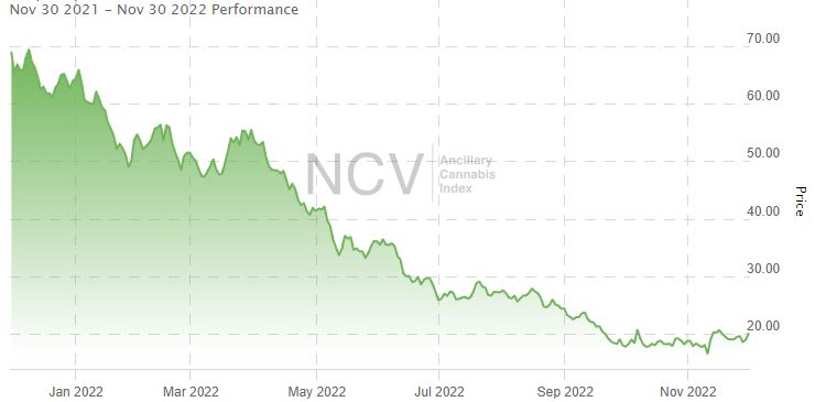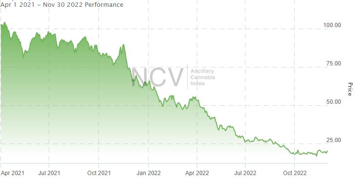 The Ancillary Cannabis Index has captured a terrible sector in 2022. It plunged 27.1% in September to an all-time closing low of 17.80 and rallied 5.6% in October to 18.80. In November, it extended the rally, gaining 6.7% to 20.06: