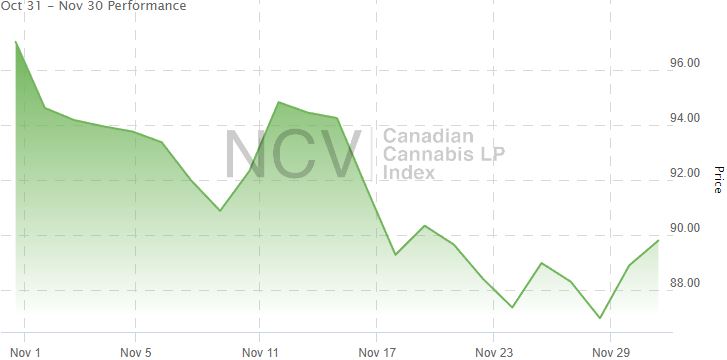 The Canadian Cannabis LP Index gave up a lot of ground in November, falling 7.5% to 89.80: