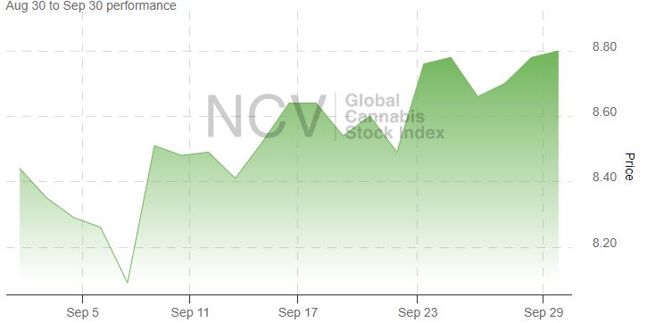 Cannabis stocks, as measured by the Global Cannabis Stock Index, passed the anniversary a year go when they exploded higher in late August on news that the Department of Health and Human Services had recommended to the DEA that it move cannabis from Schedule 1 to Schedule 3 with a weak month in August. The index had soared on the last day in April, when the DEA shared that it was officially recommending that rescheduling that had been requested, but it plunged in May and moved lower in June. In July and in the first part of August, the GCSI moved higher, but cannabis stocks fell sharply after the DEA announced late on August 26th that it was holding a hearing on December 2nd. For the month of September, the index was up 4.3% to 8.80: