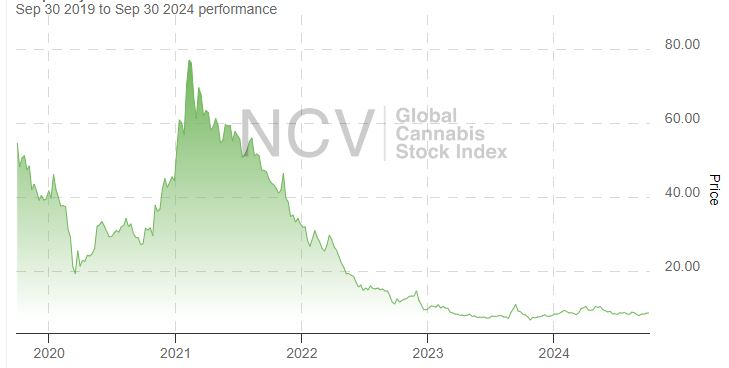 Since the peak in February 2021, the Global Cannabis Stock Index has dropped 90.5% from the 92.48 closing high: