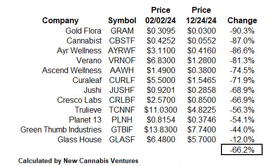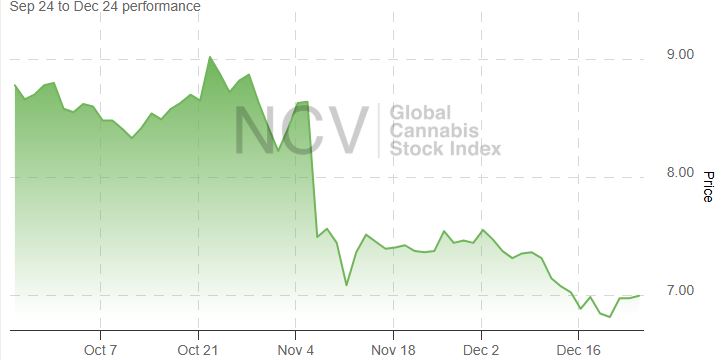 My call today is that perhaps cannabis stocks are ending their almost four-year bear market. I had hoped that the all-time low in the NCV Global Cannabis Stock Index that had been set at 6.93 in October 2023 would hold, but it did not. The index posted a new all-time closing low of 6.81, 1.7% below the old closing low, on Thursday last week, and it set a new all-time intraday low of 6.75 on Friday before rebounding. The index closed on Christmas Eve at 6.99, which is above that old all-time low and the new one too: