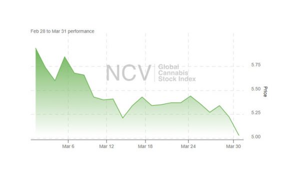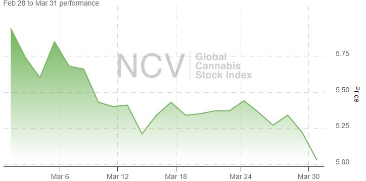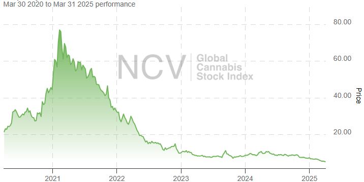Cannabis stocks, as measured by the Global Cannabis Stock Index, were quite volatile in 2024. The index dropped 7.5% in December to push the yearly close down 15.2% for the year and also has had a bad start in 2025. It posted a new all-time of 4.97 during the last day of March, and the index fell 15.3% to 5.03 during the month: