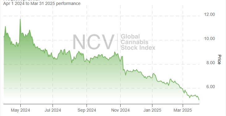 After the Q4 collapse of 21.8% to 6.88, the index dropped 7.3% in January, 6.9% in February and then again in March by 15.3%. The Global Cannabis Stock Index is now down 26.9% in 2025 and has dropped 40.8% over the past year: