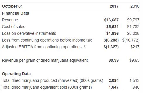 - Higher sales revenues were driven by rising demand, as dried equivalent medical cannabis sales in 2017 increased 74% from the comparable period in 2016 to 1,647 kg, at an average selling price of $9.99 per gram equivalent.